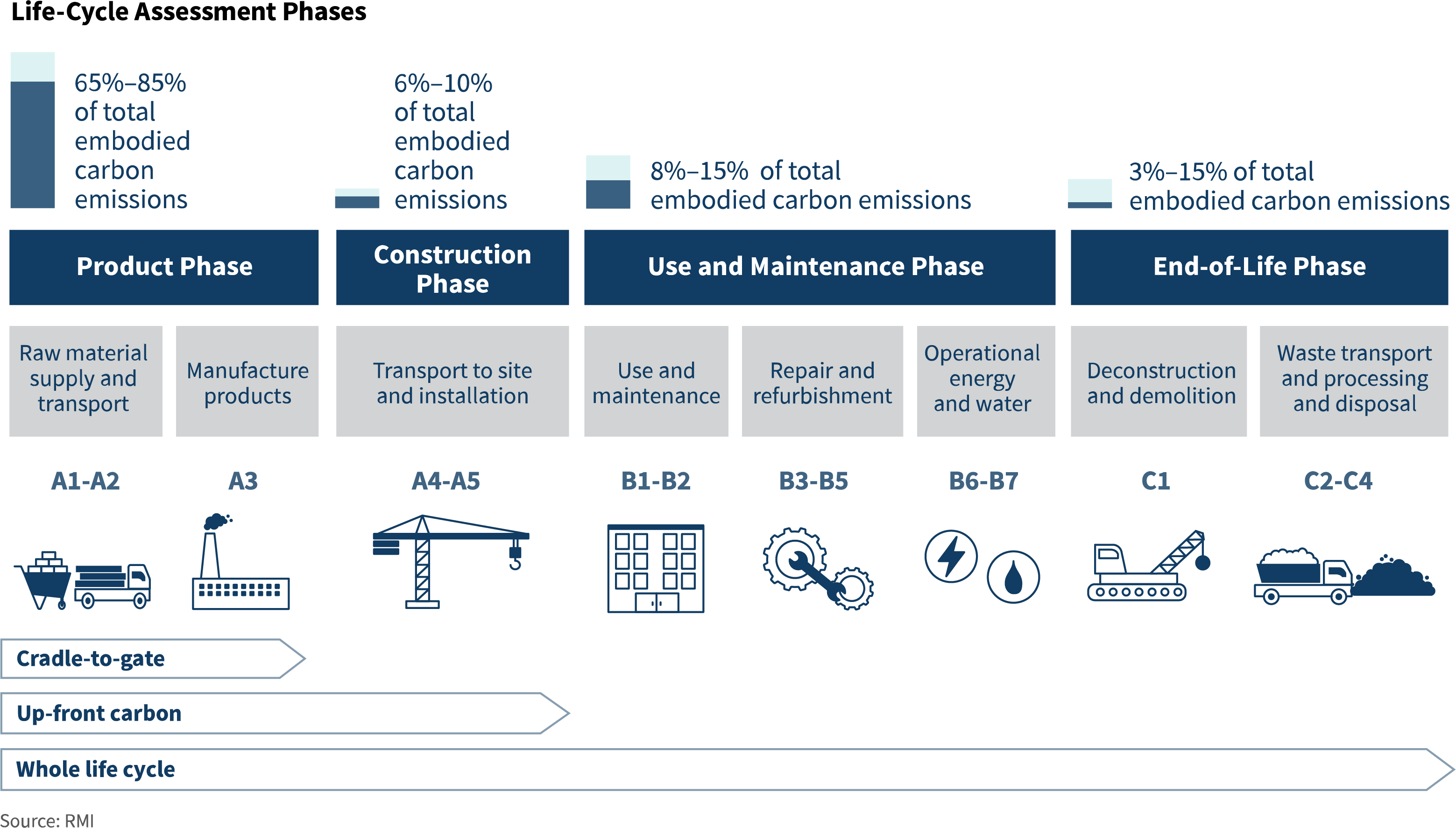 Phases of Whole-Building Life-Cycle Assessments. Embodied carbon assessments typically cover “cradle to gate” stages (modules A1–A3).