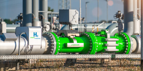 Green Hydrogen renewable energy production pipeline - green hydrogen gas for clean electricity solar and windturbine facility.