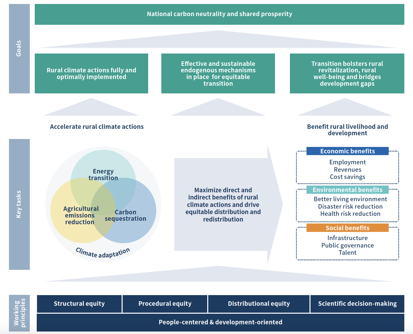 Such positive mindset shifts may bring positive outcomes by unlocking synergies to mobilize more resources and participation. It also marks gradual improvement in the understanding of a just and equitable transition, which has been a cornerstone of the Declaration and indeed the whole conference. RMI’s recent report The Rural Equitable Climate Transition toward Carbon Neutrality and Shared Prosperity illustrates a “people-centered and development-oriented” rural equitable climate transition framework, which also emphasizes maximizing the benefits of climate action in agriculture and rural areas to improve the livelihoods of farmers and rural communities (Fig. 2). It highlights the systemic and tailored implementation of a sectoral approach to climate change, such as reducing food loss and waste, optimizing agricultural production patterns and technologies, green circular agriculture, and vertical agriculture, not only to reduce emissions, but also to help increase yields and incomes, and maximize social and environmental benefits.