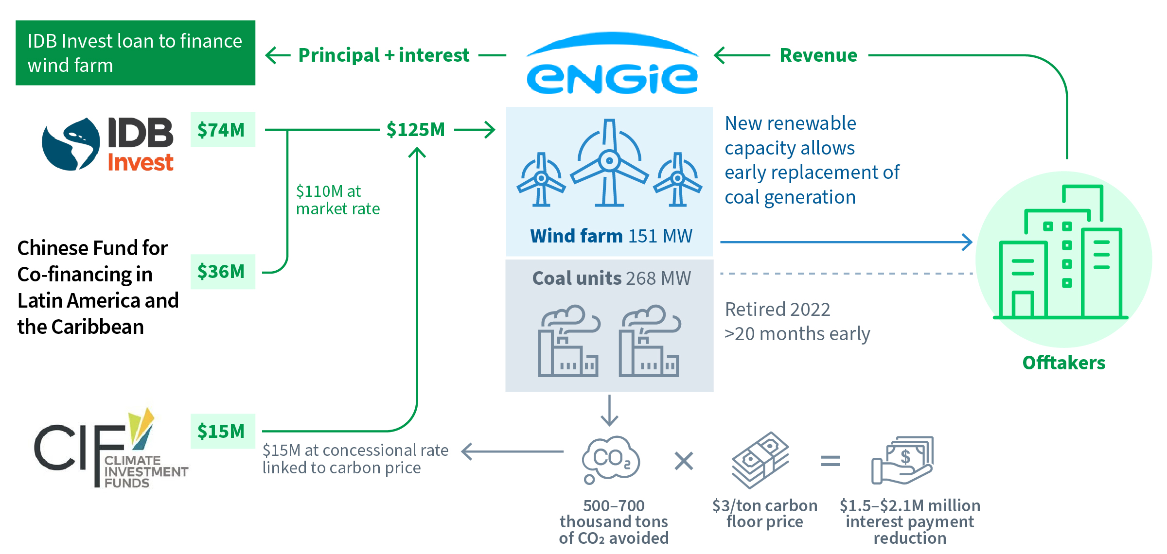 IDB Invest (the lender of record) structured and proposed a blended finance package, which incentivized EECL (the borrower) to retire operating coal assets early via a concessional debt tranche in the financing package. The loan financed the construction of new renewable generation rather than explicitly refinancing or retiring coal assets — however it was structured so that the earlier the operating coal assets were shut down, the lower the amount of interest of the concessional tranche EECL would need to pay at maturity of the loan. The amount of the interest rate reduction depends on a pre-agreed carbon price multiplied by a capped volume of carbon saved via early retirement. Additional details on the Tocopilla coal units can be found in Appendix Exhibit 1.1.