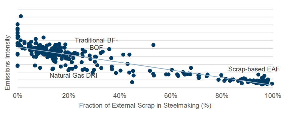 The carbon intensity of steelmaking varies not just by technology type but also by the share of primary versus recycled material inputs used in production. Primary steel production is significantly more carbon-intensive than secondary production since it largely uses metallurgical coal to reduce iron ore. A single benchmark for the sector could incentivize steel producers to increase the use of scrap as a decarbonization strategy but — since global scrap availability is finite — this strategy is limited as it could result in scrap being redistributed rather than in emissions reductions. The Sustainable Steel Principles differentiate between primary and secondary steelmaking, keeping the focus to transitioning primary steel production which requires the adoption of clean end-state technologies rather than a more incremental approach that risks moving emissions between steelmakers.