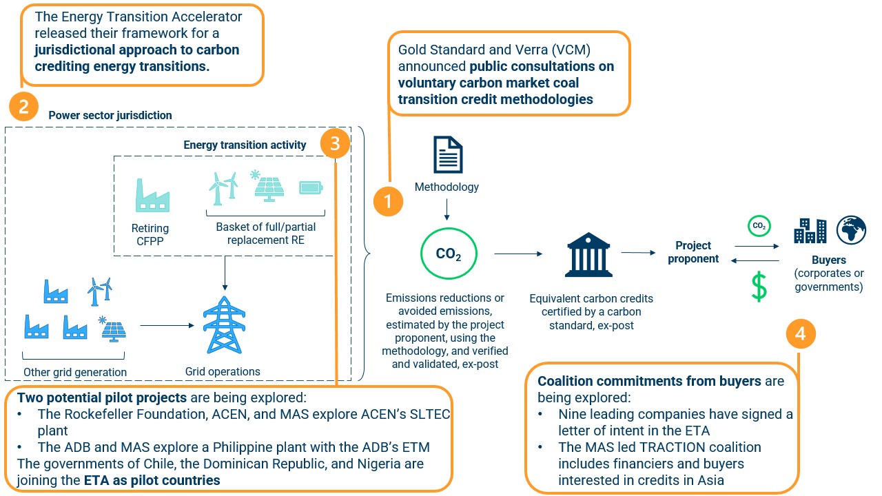 The US Department of State, Bezos Earth Fund, and Rockefeller Foundation have presented the core framework of the Energy Transition Accelerator (ETA) to support a jurisdictional, power-sector-wide crediting approach. This differs from a project-based approach by quantifying and monetizing the emissions reductions across a jurisdiction’s entire power sector over time, rather than just within a project boundary. As a result, it can incentivize a wide variety of transition activities including public policies and regulation, coal-to-clean power plant replacement, and grid infrastructure investment.