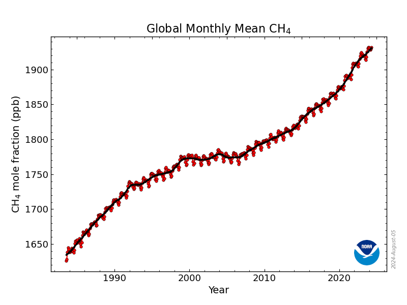 Atmospheric methane concentrations have risen even faster than CO2. As of April 2024, methane concentrations nearly tripled since pre-industrial times to 1932 parts per billion (ppb). Moreover, some of the largest-ever double-digit increases of 10-18 ppb annually occurred since 2020.